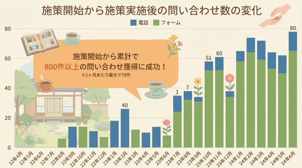 ・2022年4月からの施策開始後、地域キーワード対策で流入数800%に拡大し、問い合わせ数が大幅に増加。
